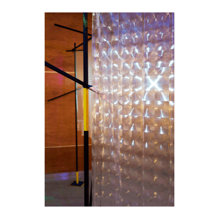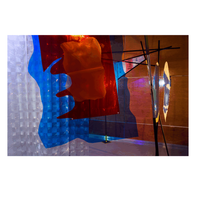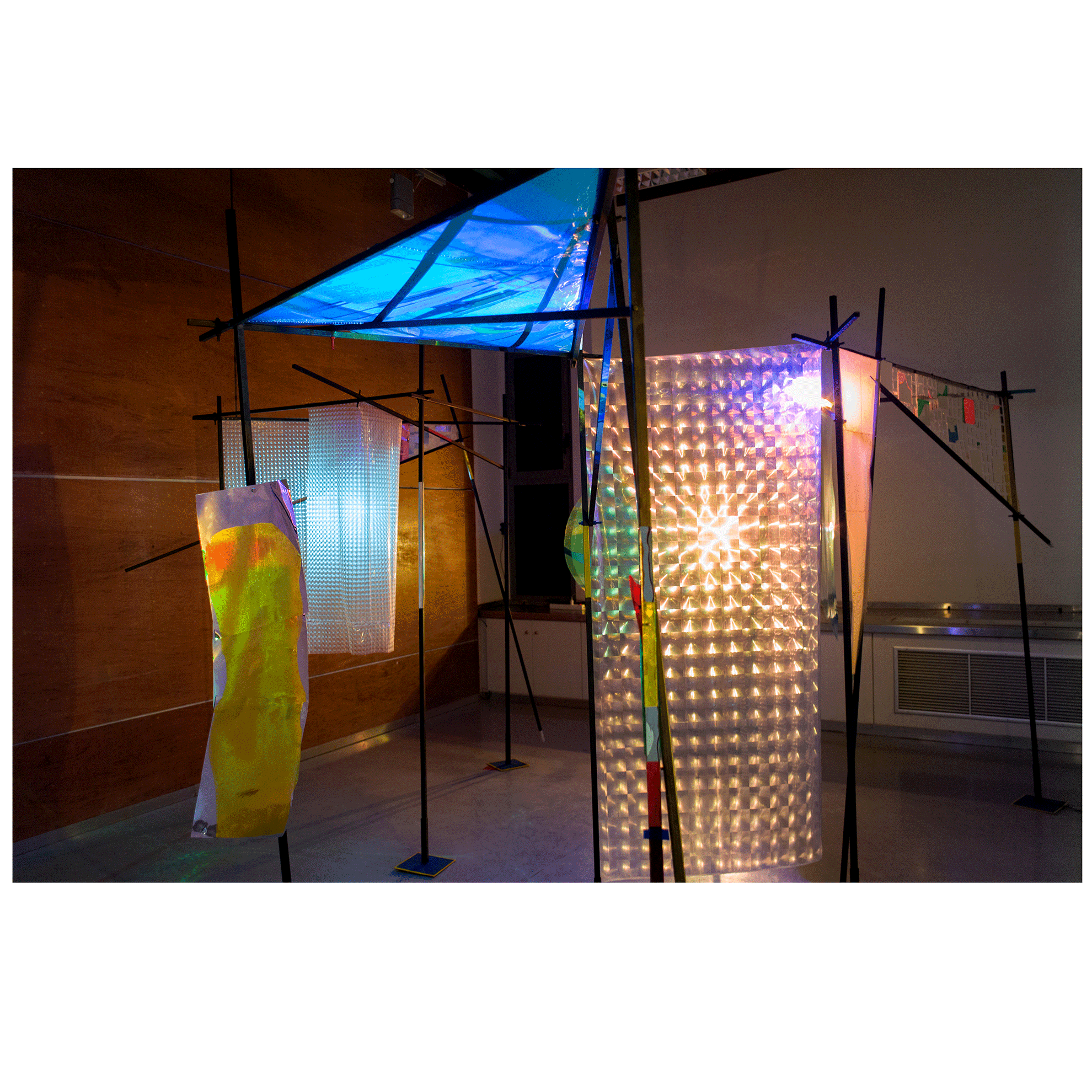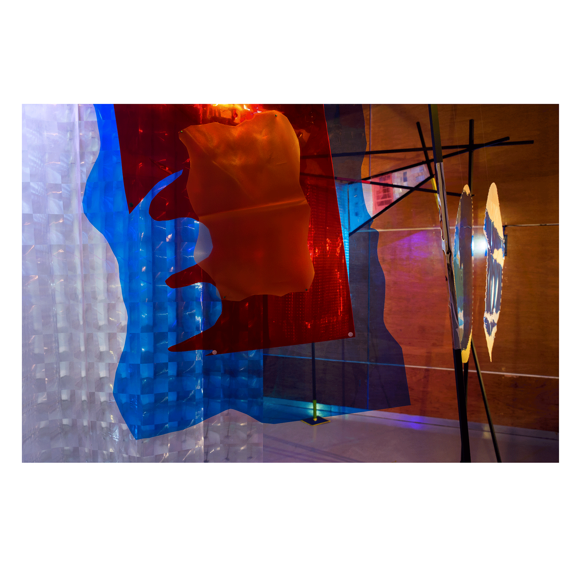 Transparent Colors Conjure Landscapes is a spatial installation on a human scale. It explores various interpretations of reality and examines the elements that contribute to creating a unique version each time. Inviting viewers to navigate the space and actively engage with the work, it encourages them to momentarily leave their imprint through a camera that live-streams the space in a section of the installation. Shadow, color and multiple layers are key elements of this work..
