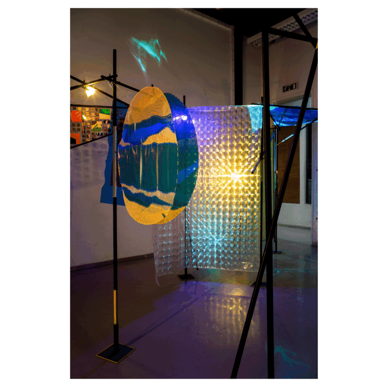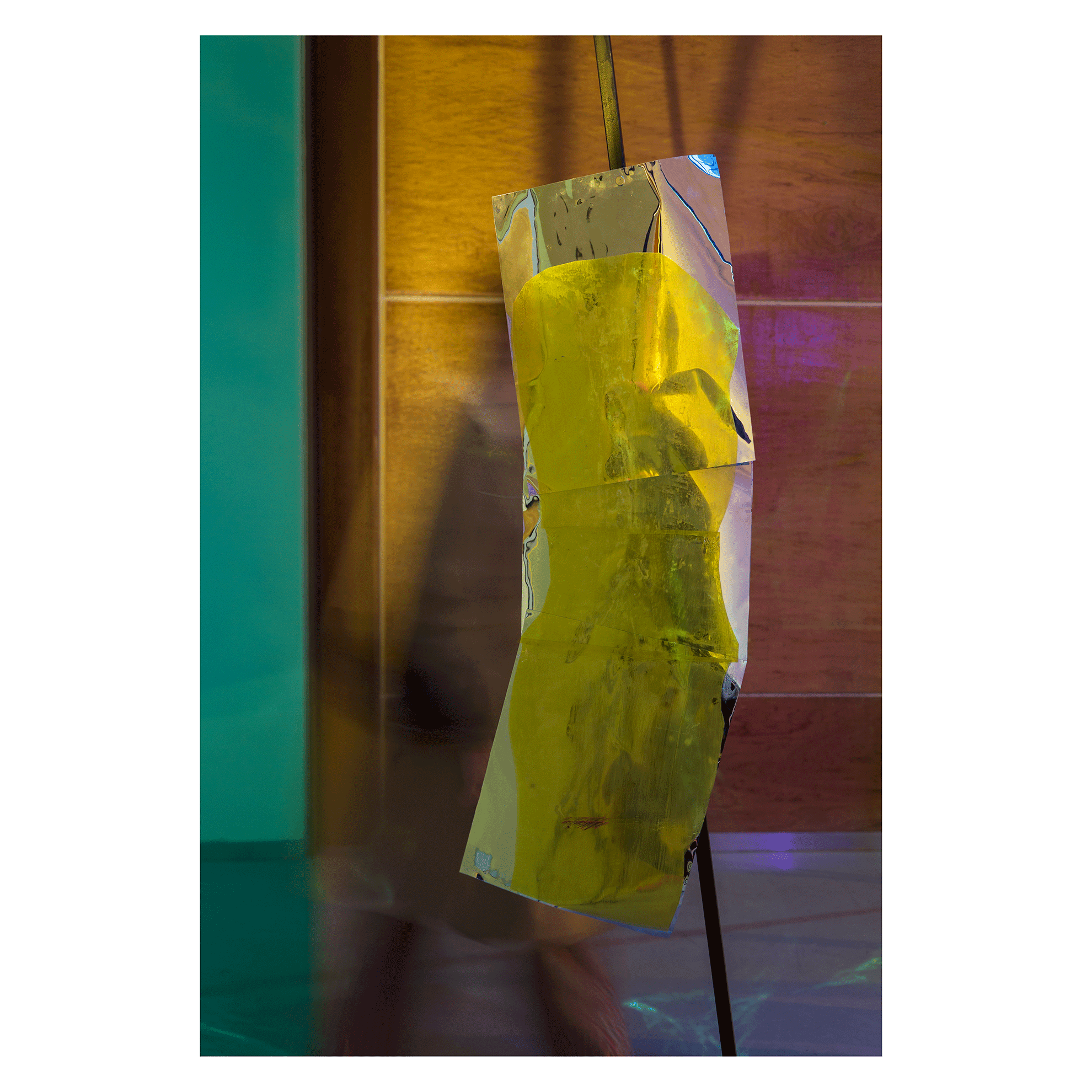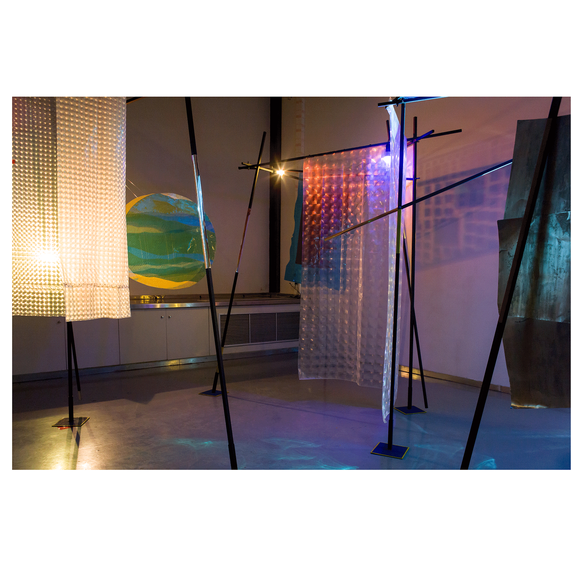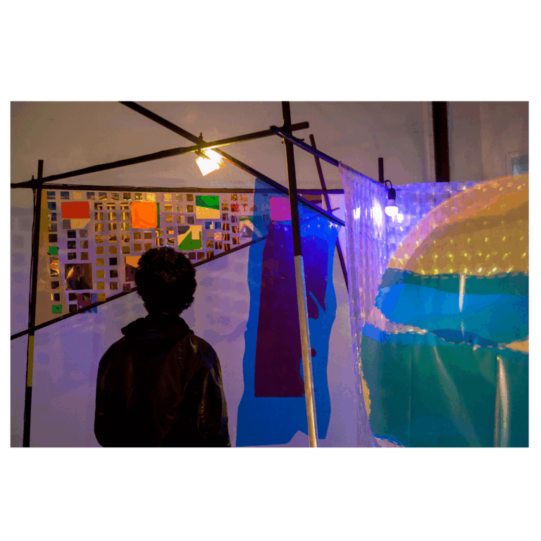 Transparent Colors Conjure Landscapes is a spatial installation on a human scale. It explores various interpretations of reality and examines the elements that contribute to creating a unique version each time. Inviting viewers to navigate the space and actively engage with the work, it encourages them to momentarily leave their imprint through a camera that live-streams the space in a section of the installation. Shadow, color and multiple layers are key elements of this work..